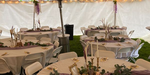 Tents from 10x10 to large enough to cover hundreds! Dance Floors, Tables, Chairs, Padded Folding chairs, table linens, Lighting, Chandeliers for Tents, Dunk Tanks, Inflatables and Games, tent uplighting in any color of your choosing, propane heaters, elegant tent liners and more.