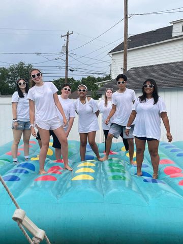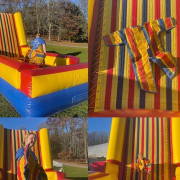 Participants put on a Velcro Suit, bounce on the inflated jump area, and stick to the wall! Everyone will love to try and jump to the highest point. We have different sizes of velcro suits one adult and one child size comes with the rental. 21' Long, 13' Wide, 11' High. Required to be staked in grass or soft area to support the wall Weight when participants jump.