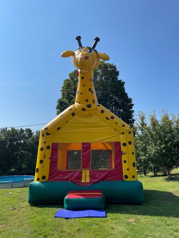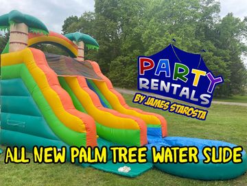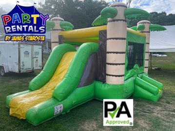 Just like it bigger sibling the Palm Tree Combo. This unit is a Bounce house with a slide attached. Unit measures 19.5’ x 15‘ x 13’. Unit requires power cord within 10‘ of bounce or you can rent power cords from Party Rentals. Unit requires 120 V power for the blower motor.
