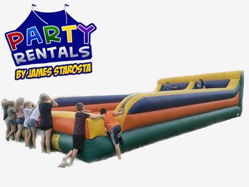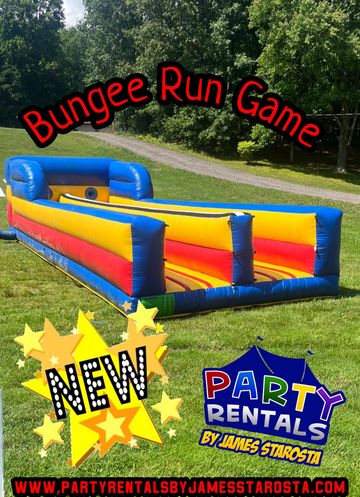 Players wear a vest and attach bungee cords to the vest. Object of the game is to run as far as you can and place the Velcro baton and as far as you before the bungee pulls you back. This also is the platform for jousting. Two padded pedestals are applied and two opponents can joust. Jousting a not included. You can rent both games on request.