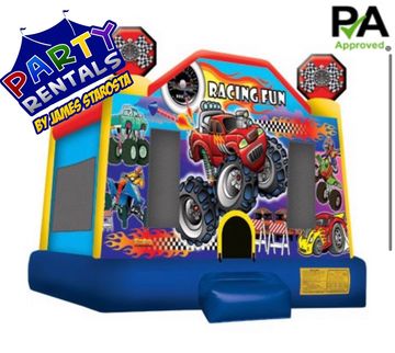 Racing Fun Bounce house with car and monster truck racing theme with extended checkered flag corner posts. supports up to 800lbs capacity. Requires power source 120V for motor.